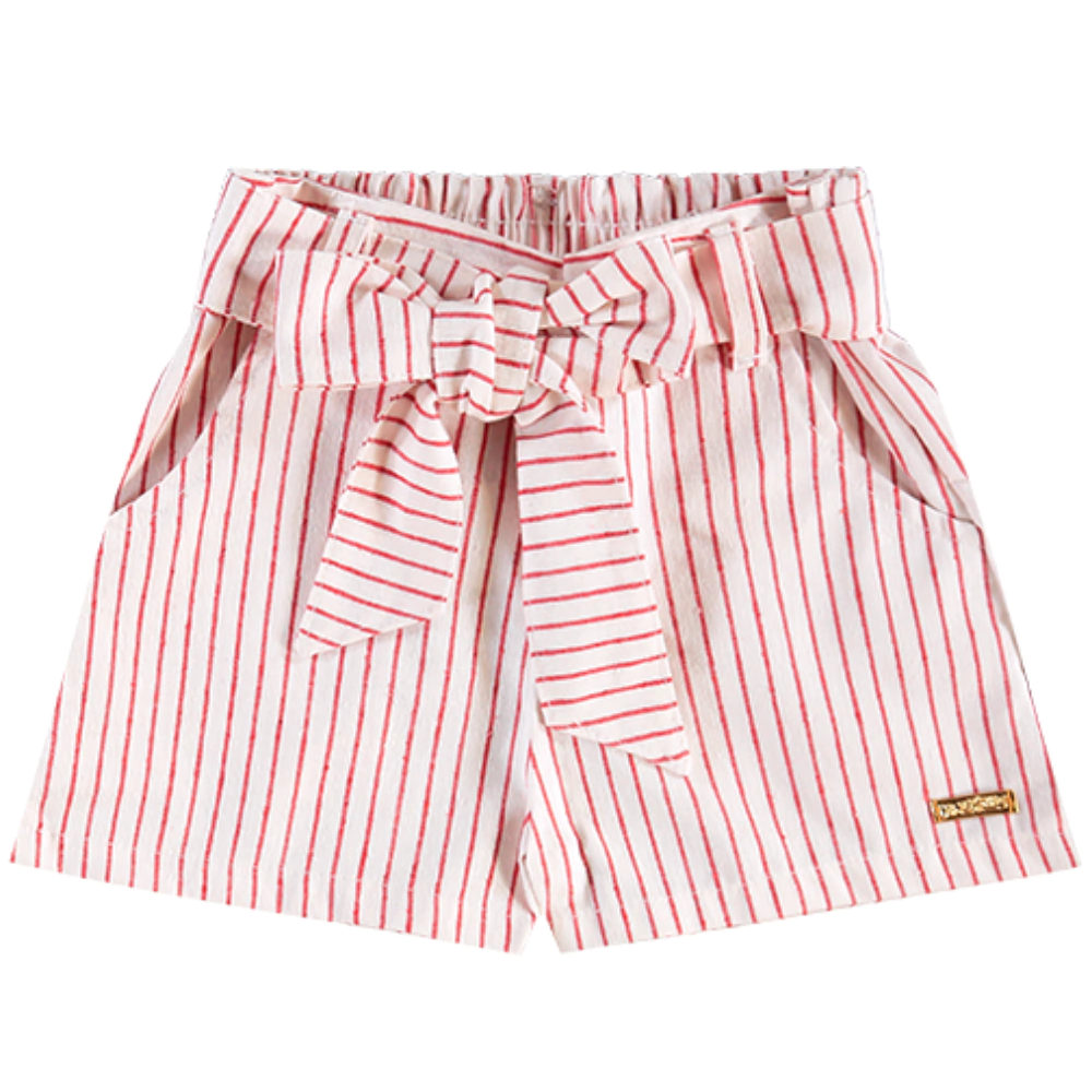 O short completa o look com estilo e conforto, feito em linho (100% fibras diversas), com estampa listrada e faixa para amarração.