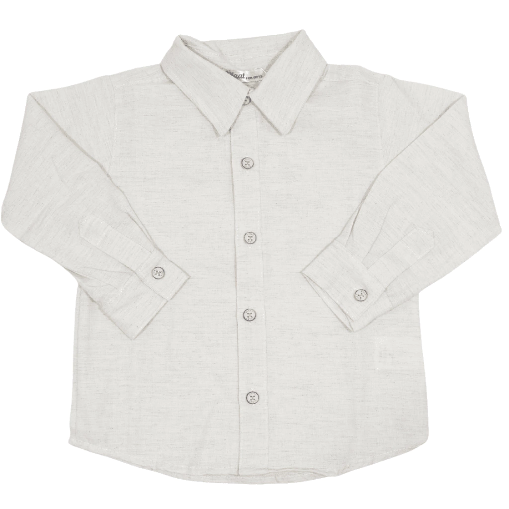 Conjunto de camisa linho (94% algodão e 6% poliester) e calça em sarja com elástico na cintura (97% algodão e 3% elastano)
