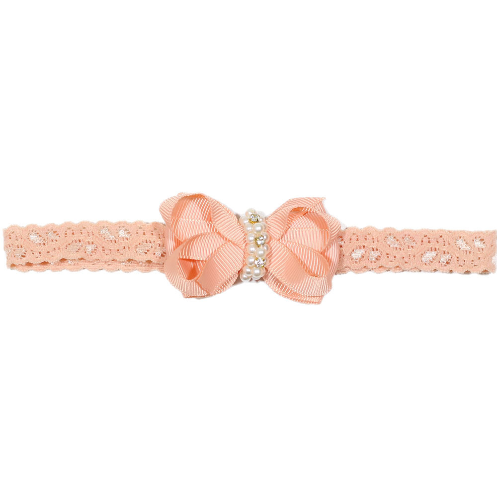 Faixa pêssego com laço delicado e aplicação central de pérolas e strass dourado