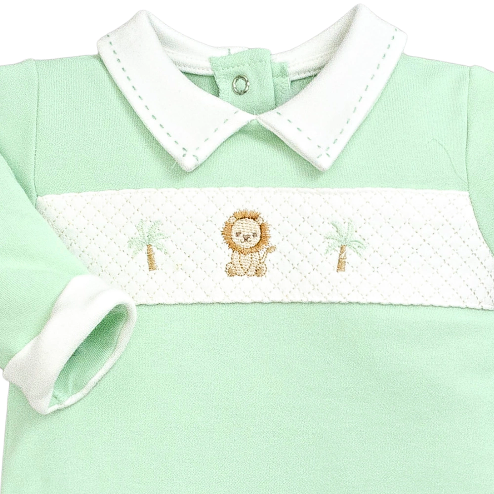 Essa saída de maternidade é confeccionada em algodão pima, considerado o melhor algodão do mundo pela sua maciez extrema, durabilidade superior e toque sedoso. O macacão possui bordado clássico de leão e palmeiras, gola com acabamento delicado e abertura inferior com botões de pressão que facilitam as trocas. A manta coordenada completa o conjunto com suavidade e elegância.