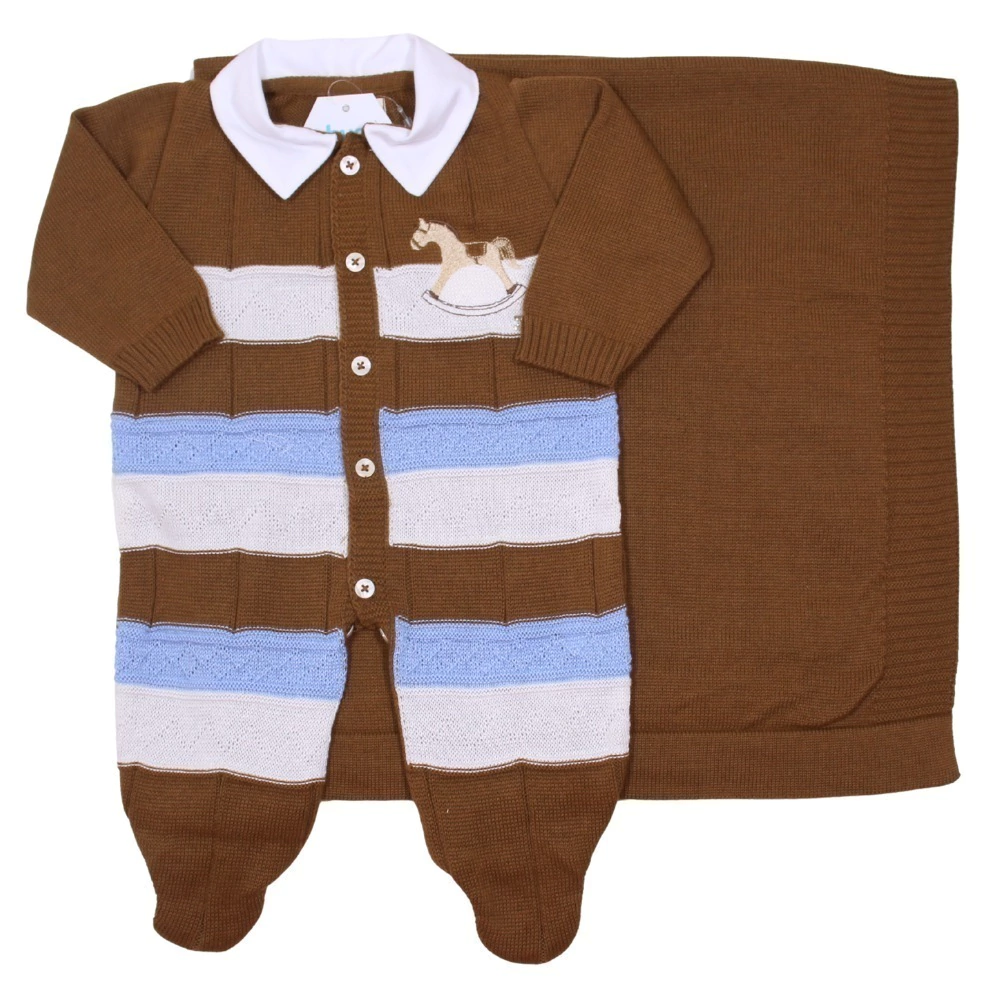 A Saída de Maternidade é composta por um conjunto de tricô (manta e macacão -100% acrílico antialérgico), combinando elegância e conforto para a seu pequeno. Com detalhe golinha bordada, essa peça traz um toque especial e cheio de amor para a chegada do seu bebê.